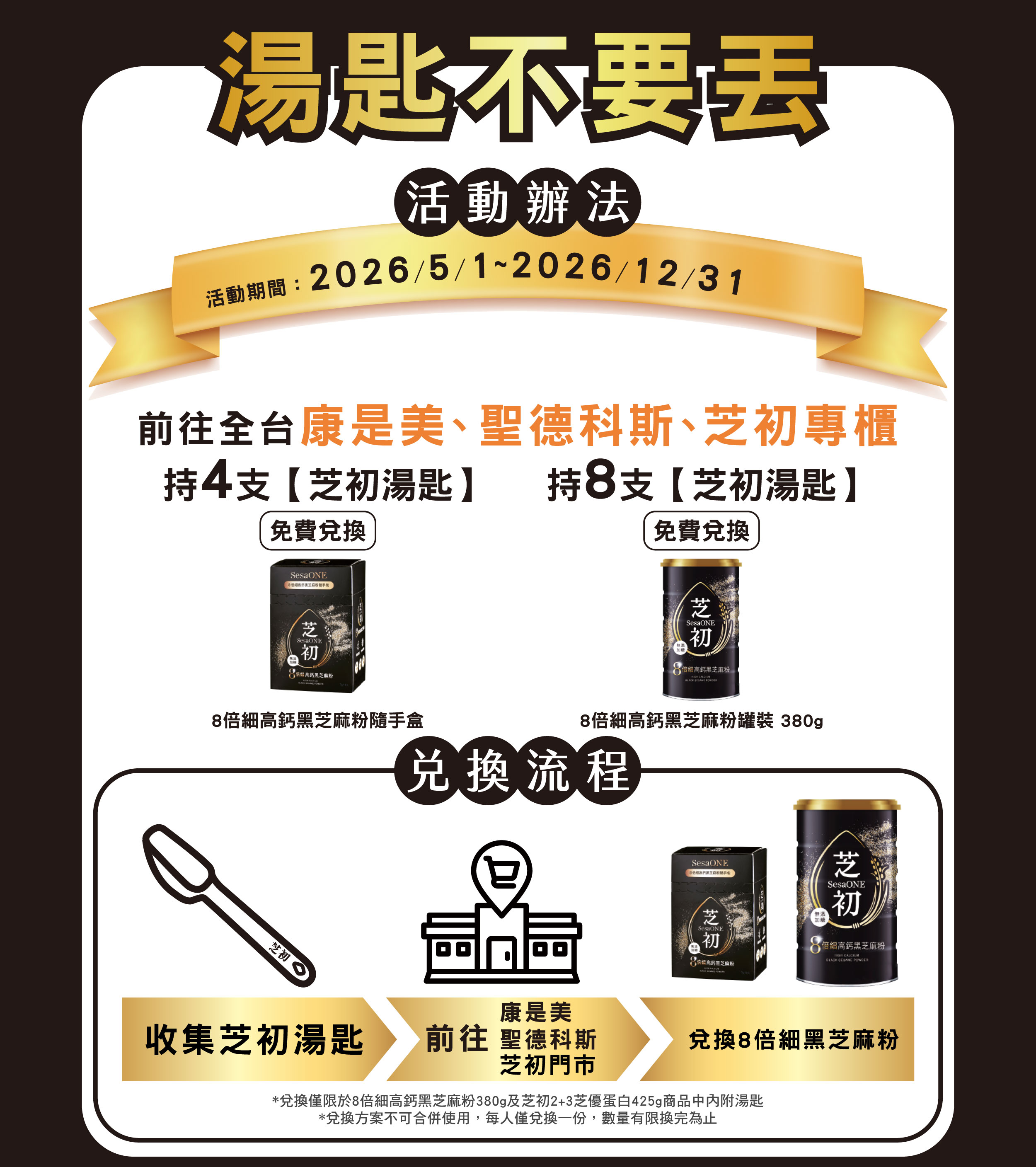 兌換僅限於芝初湯匙(8倍細高鈣黑芝麻粉380克、芝初2+3芝優蛋白425克商品中內附湯匙),總長度約為16cm,並印有芝初LOGO字樣。如持無芝初LOGO、破損或舊版之湯匙,恕無法進行兌換。兌換時將由門市人員回收湯匙。